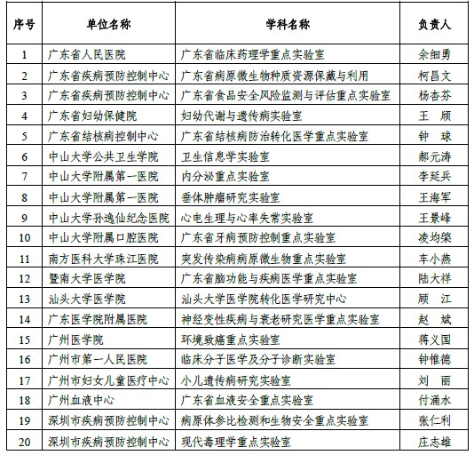 廣東省“十二五”醫(yī)學(xué)重點實驗室名單