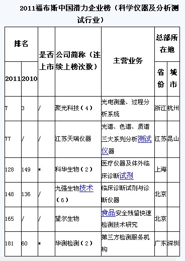 2011年1月10日,《福布斯》中文版在上海發(fā)布其年度首份榜單——2011中國潛力企業(yè)榜,聚光科技、江蘇天瑞儀器、望爾生物、華測檢測等多家科學儀器及分析測試行業(yè)企業(yè)入選“2011福布斯中國潛力企業(yè)榜”。