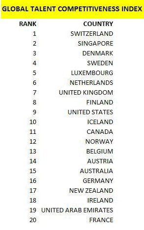 《全球人才競爭力指數》(the Global Talent Competitiveness Index)針對全球 103 個國家,涵蓋人口占世界人口 86.3%。研究顯示,瑞士排行榜首,新加坡獲得第二名,丹麥獲得第三名。亞洲國家中,日本排列第21名,韓國第28名。盡管中國是全球第二個最重要的經濟體,卻排行第47名。