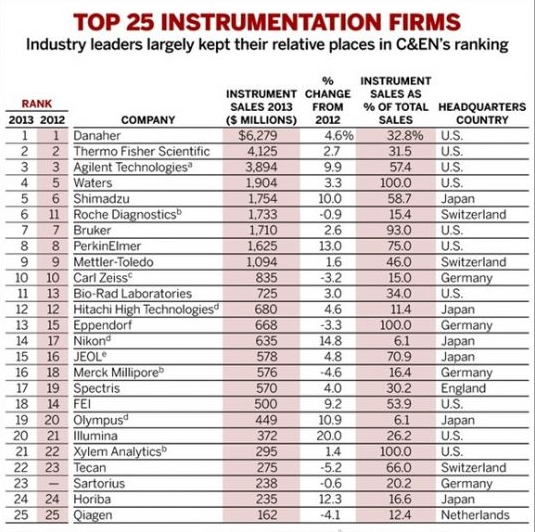 在今年揭曉的2013年全球儀器公司排名前25名單中,排名前十情況與2012年變化不大,排名第一依然為丹納赫(Danaher),排名第二為賽默飛世爾科技(Thermo Fisher Scientific,Life Technologies的2013年收入未記在內(nèi)),排名第三為安捷倫(Agilent Technologies)。其中,排名發(fā)生最大變化的是羅氏診斷(Roch Diagnostics),它從2012年排名第11上升至排名第6;并且由于Life Technologies被賽默飛世爾收購,Life Technologies從排行榜中消失。此外,賽多利斯(Sartorius)首次進榜,排名第23位。詳細名單名單見下:
