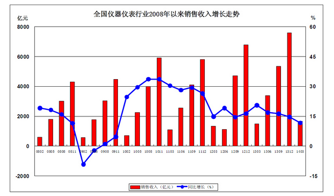 1、全國(guó)儀器儀表行業(yè)2008年以來(lái)銷(xiāo)售收入增長(zhǎng)比較