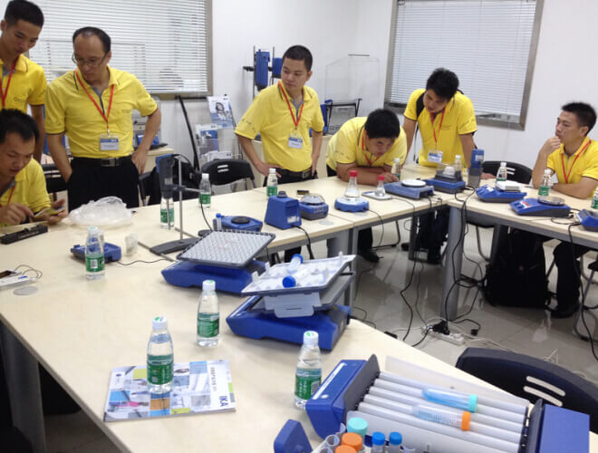 在儀器展示區(qū),IKA技術(shù)人員針對不同產(chǎn)品,就類別、原理、功能、技術(shù)參數(shù)、維修保養(yǎng)技巧,為我們銷售人員做了詳細解說。并給予現(xiàn)場演示操練時間。待廣州深華銷售人員徹底了解后,連連稱贊。兩家公司關系極其融洽。